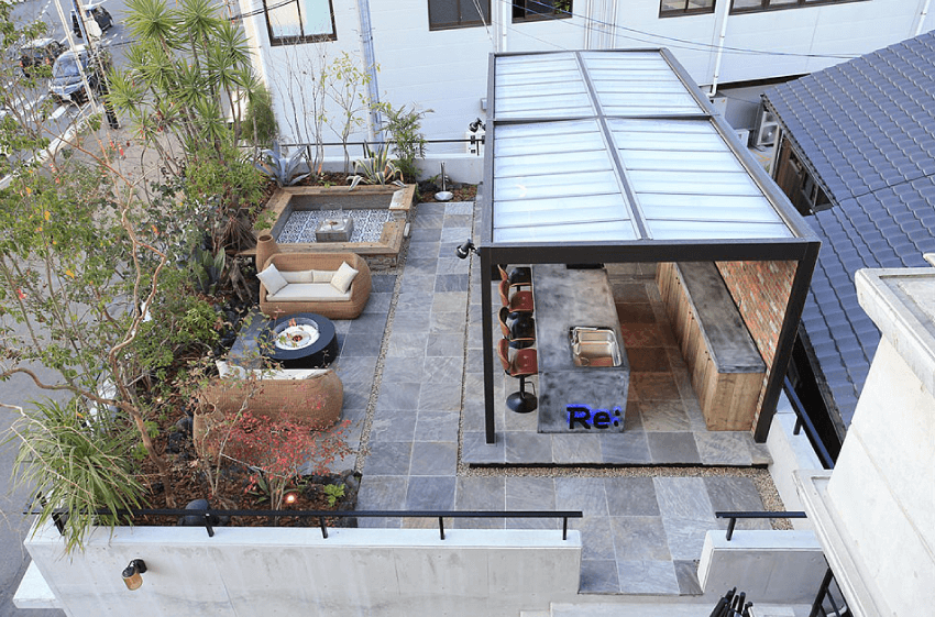 この『ブルックリゾート』は、レンガ・石・足場板などのビンテージ感と、炎の揺らぎ・水のある空間・南国植物のリゾート感を融合する新たなスタイルです。